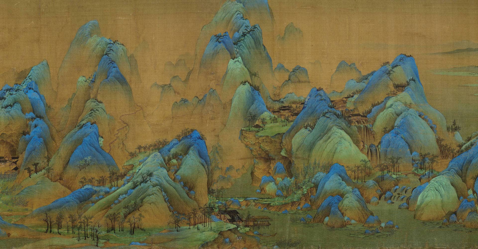 《千里江山图》是北宋王希孟创作的绢本设色画,现收藏于北京故宫博物院。研究指出,《千里江山图》的主要取景地是庐山和鄱阳湖。 [7]该作品以长卷形式,立足传统,画面细致入微,烟波浩渺的江河、层峦起伏的群山构成了一幅美妙的江南山水图,渔村野市、水榭亭台、茅庵草舍、水磨长桥等静景穿插捕鱼、驶船、游玩、赶集等动景,动静结合恰到好处。在该作品人物的刻画上,极其精细入微,意态栩栩如生,飞鸟用笔轻轻一点,具展翅翱翔之态。《千里江山图》画卷,不仅代表着青绿山水发展的里程;而且,集北宋以来水墨山水之大成,并将创作者的情感付诸创作之中。《千里江山图》虽属于写意之作,但不乏工美佳作,表现了青年画家具有严谨的生活态度。《千里江山图》是中国十大传世名画之一。